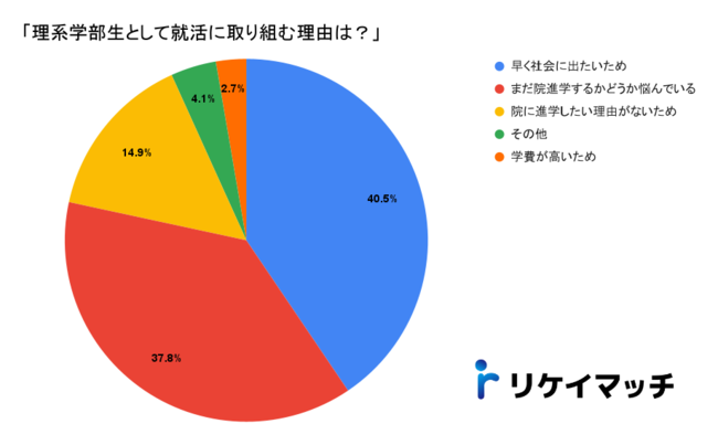 設問「理系学部生として就職活動に取り組む理由は?」に対する回答割合は、「早く社会に出たい」が全体の40.5%と最多を占めました。学部卒の就職志望者としては「院に進学したい理由がないため」、「学費が高いため」を合わせると58.1%になります。その一方、37.8%が「まだ院進学するかどうか悩んでいる」と回答しています。