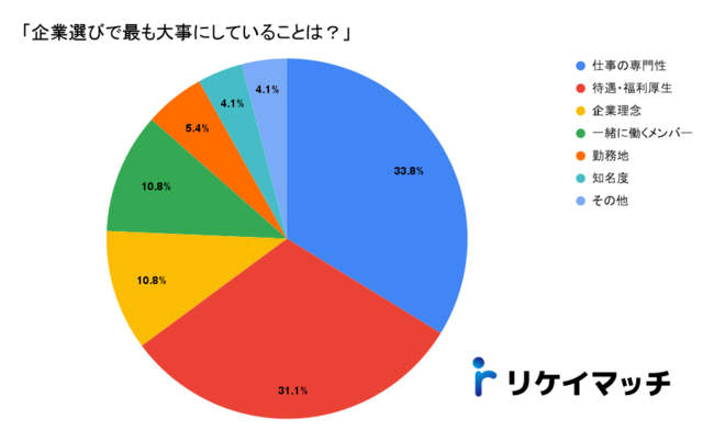 設問「企業選びで最も大事にしていることは?」に対する回答割合は、「仕事の専門性」が全体の33.8%と最多を占めました。次点では「待遇・福利厚生」が31.1%、そして3番目として「一緒に働くメンバー」、「企業理念」が10.8%という同列結果となりました。