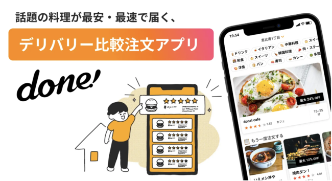 done!(ダン)は、フードデリバリーを横断検索して注文できるアプリです。サービスごとに異なる料金や時間を一括で比較し、ユーザーにとって最適なデリバリーを提案します。8月12日の正式版リリースから、対応都道府県も13まで増加し、MoMで200%超の成長を維持しています。年内に全国対応し、サービスのアップデートを繰り返しながら、更なる成長へ向けて邁進してまいります。
