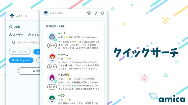 クイックサーチは、ご自身がプレイしているゲームと同じゲームで遊んでいるユーザーを探すことができる機能です。ユーザー登録時に選択したゲームがAmicaの検索ページ上に表示されているので、そこでプレイしたいゲームを選択しボタンを押すと、同じゲームをプレイしているユーザーをすぐに見つけることができます。