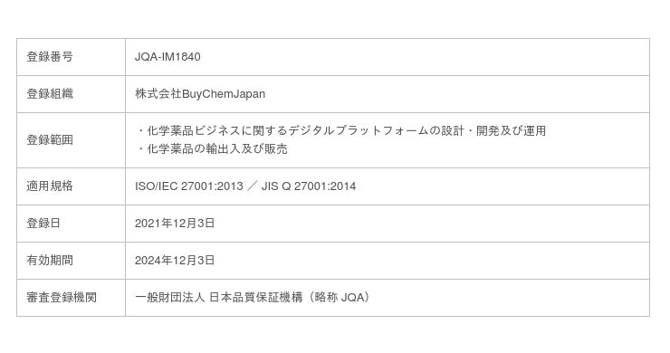 化学品マーケットプレイスの開発および運営をする株式会社BuyChemJapan(本社:大阪府大阪市北区、代表取締役:大口 真豪、以下当社)は2021年12月3日にISMS(情報セキュリティマネジメントシステム)の第三者認証基準である国際規格「ISO/IEC27001:2013」および国内規格「JISQ27001:2014」の第三者認証を取得しました。