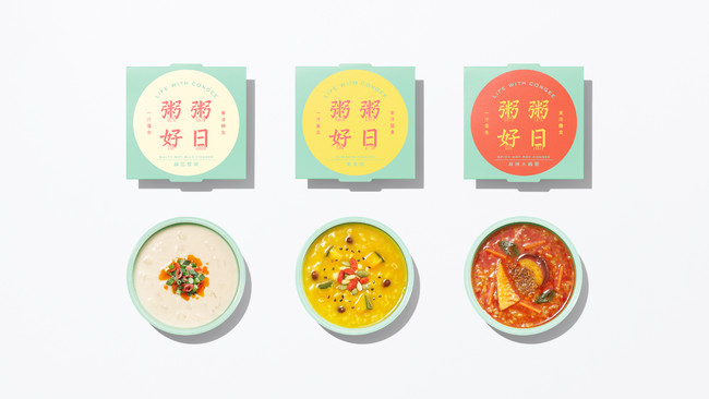 商品名:「粥粥好日(カユカユコウジツ)」写真左から<鹹豆漿粥(シェントウジャンガユ)><南瓜粥(カボチャガユ)><麻辣火鍋粥(マーラーヒナベガユ)>の3商品。