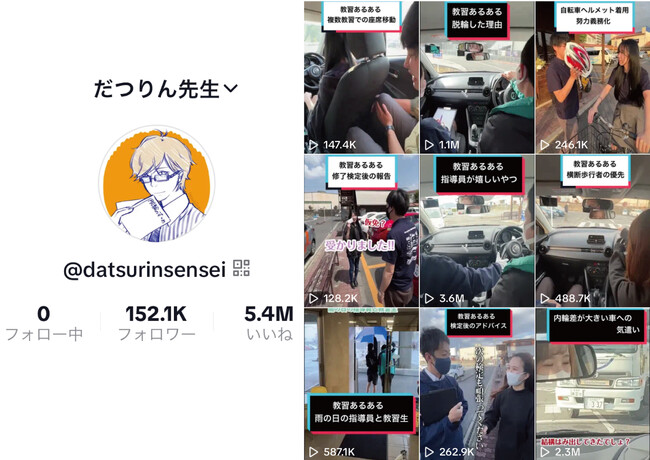 当社は、運転と交通安全に関連するYouTubeなどのSNS活動を3年前から実施しています。特に中高生に人気の動画投稿アプリTikTok(アカウント名:だつりん先生)では、フォロワー数約15万人、総再生回数約1億5千万回と教習所業界日本一を記録しています。