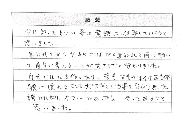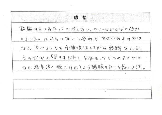 マナーを知れてよかった、根気強く頑張りたい、自分から動いていくようにしたい、など働く気持ちを新たにした感想が多数寄せられました。