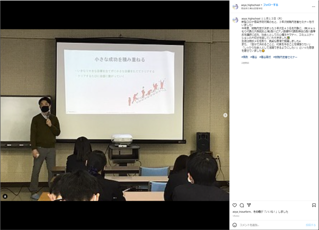 さらに、講演終了後は青谷高校さんの公式Instagramでも投稿があり、講師陣のメッセージがしっかりと届いたことが分かりました。