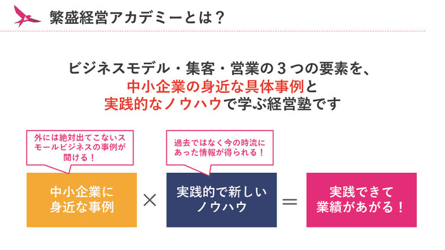 一般社団法人企業共創支援機構では、経営者のためのコミュニティ「つむぎ会」を2022年4月より運営しています。無料会員も含めると会員数は1000社を突破、繁盛経営アカデミーは経営者を対象に