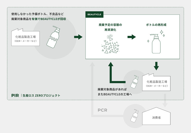 当プロジェクトは、容器生産過程において多くのロスが発生しているという課題に着目、この課題解決に向けて始動、一般的なリサイクルフローである、消費者からの収集ではなく、化粧品やトイレタリー用品を“生産する”際に発生する容器のロス削減に向けた業界初※となる取り組みです。