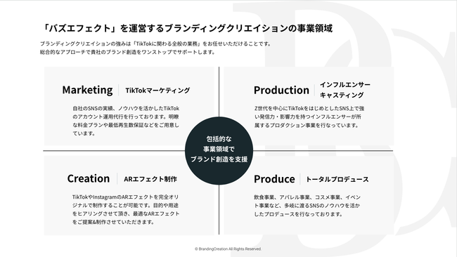バズエフェクトを運営する株式会社BrandingCreationは、Z世代を中心にTikTokをはじめとしたSNS上で強い発信力・影響力を持つインフルエンサーが所属するプロダクション事業や自社のSNSの実績、ノウハウを活かしたTikTokのアカウント運用代行も行っております。