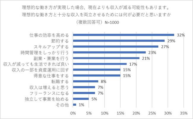 理想的な働き方が実現した場合、現在よりも収入が減る可能性があります。そこで、「理想的な働き方と十分な収入を両立させるためには何が必要だと思いますか」(複数回答可)と質問したところ、トップ3は「仕事の効率を高める」(32パーセント)、「節約する」(29パーセント)、「スキルアップする」(27パーセント)となりました。