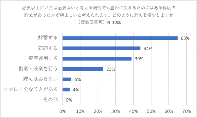 また、必要以上にお金は必要ないと考える場合でも豊かに生きるためにはある程度の貯えがあった方が望ましいと考えられます。「どのように貯えを増やしますか」(複数回答可)と質問したところ、「貯蓄する」との回答が65パーセントで2位以下を大きく引き離してトップとなりました。2位は44パーセントの「節約する」、3位は39パーセントの「資産運用する」でした。