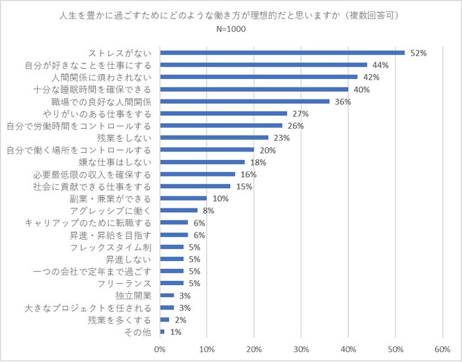 次に「人生を豊かに過ごすためにどのような働き方が理想的だと思いますか」(複数回答可)と尋ねたところ、「ストレスがない」が52パーセントで最も多い回答を集めました。以下、「自分が好きなことを仕事にする」(44パーセント)、「人間関係に煩わされない」(42パーセント)、「十分な睡眠時間を確保できる」(40パーセント)、「職場での良好な人間関係」(36パーセント)が続きました。