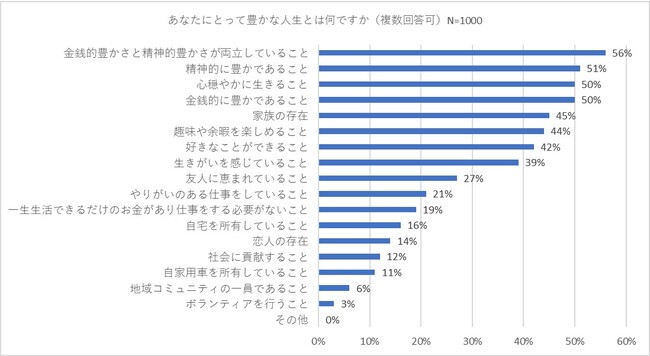 30〜40代の働き盛り世代の男女1,000人に「あなたにとって豊かな人生とは何ですか」(複数回答可)と質問しました。その結果、「金銭的豊かさと精神的豊かさが両立していること」が56パーセントでトップ。2位〜3位はほぼ同じ割合で「精神的に豊かであること」(51パーセント)、「心穏やかに生きること」(50パーセント)、「金銭的に豊かであること」(50パーセント)が続きました。