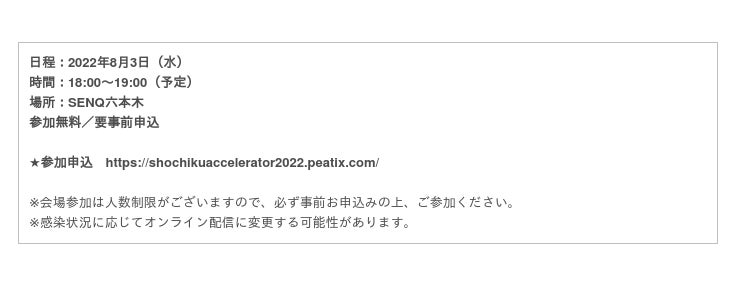 8/3(水)事前説明会を開催 https://shochikuaccelerator2022.peatix.com/