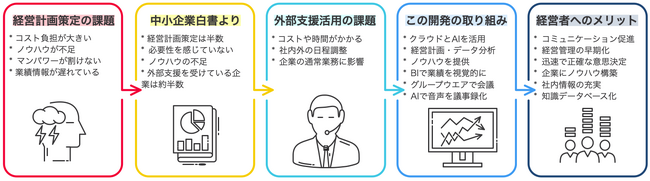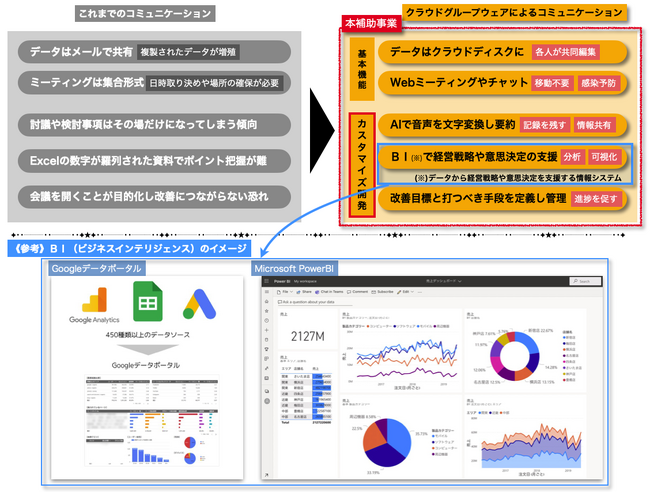 上記のような課題に対して、クラウドとAIを活用して、経営計画やデータ分析のノウハウを提供しています。BI(ビジネスインテリジェンス)で業績を視覚的に表現し、グループウエアで会議などコミュニケーションを効率化し、AIで音声を議事録化することもをスコープにします。これらのサービスメニューは、ビジネスの成長に貢献すると確信しています。