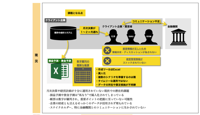 企業の経営管理を低コストでタイムリーに提供することを目指し、クラウドとAIを活用した新しいサービスソリューションを開発します。常に最新の業績を把握し、迅速かつ的確な経営判断ができる環境を支援します。