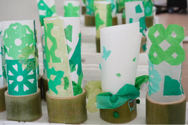 展示したランタンは、すべて事前ワークショップ(8月12〜16日の5日間)に参加した来館者が制作したもので、その数は500個以上にのぼります。今年は「竹を知ろう」をテーマに、輪切りした竹を土台に、飾り紙でデコレーションしたランタンを制作・展示しました。竹の仕入れについては、品川区武蔵小山にある大正15年創業の庭園・造園資材卸の株式会社山十(やまじゅう)に依頼し、輪切りの加工など多大なご協力をいただきました。