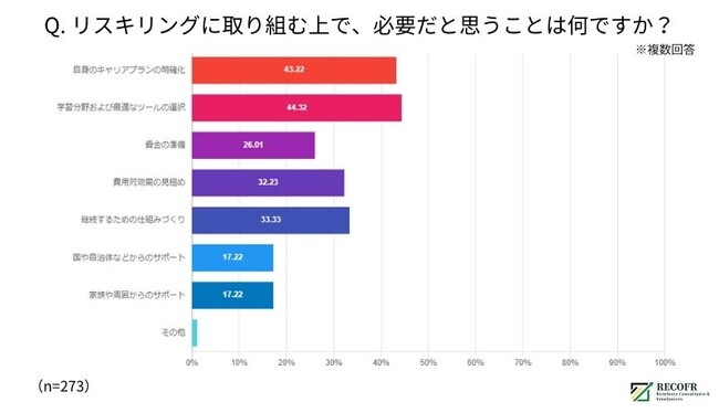 リスキリングに取り組む上で必要だと思うことは「学習分野および最適なツールの選択(44.3%)」と「自身のキャリアプランの明確化(43.2%)」、この2つの回答割合が非常に高くなりました。