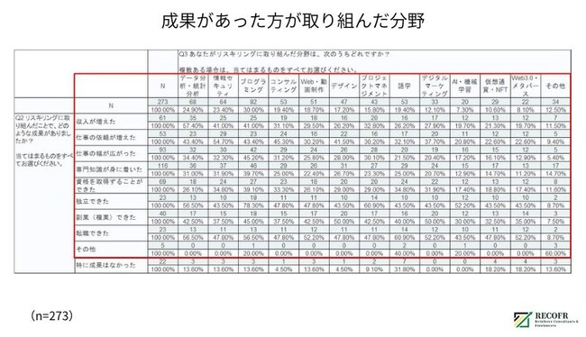 実際にリスキリングが「成果につながった」と回答したフリーランスは、「プログラミング」「データ分析・統計分析」「情報セキュリティ」の3つの分野に取り組んでいる割合が高いという分析結果が得られました。中でも「プログラミング」は、専門知識の習得により仕事の幅が広がったと回答した方が多く、「データ分析・統計分析」はダイレクトに収入増加につながった方が最も多い分野でした。