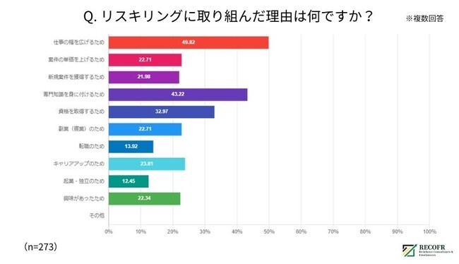 リスキリングに取り組んだ理由の第一位は「仕事の幅を広げるため」、専門知識や資格取得を目標とするフリーランスも多数