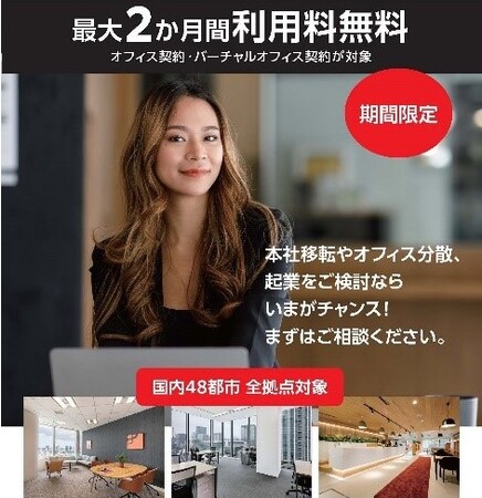 リージャスでは12月1日より期間限定で、国内48都市にある全拠点を対象に、オフィス契約・バーチャルオフィス契約の利用料が最大2か月間無料になるキャンペーンを行っております。