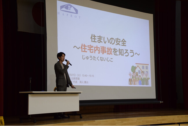 講師を務めた株式会社HAPROT代表・満元(みつもと)は作業療法士の知識・経験を基に住宅内事故を予防するための間取り設計「安全持続性能」を提唱しており、今回第1回目の授業を行っています。