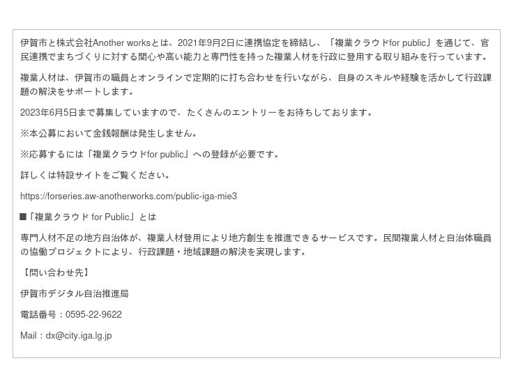 三重県伊賀市、複業クラウドfor publicを活用して複業人材を募集!【応募締切:6月5日まで】