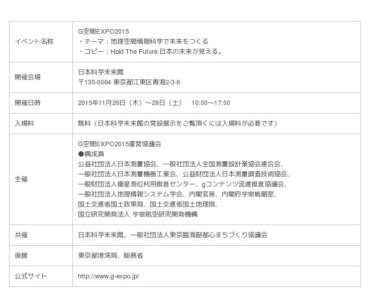 G空間EXPO2015運営協議会(国土交通省国土政策局、国土地理院 ほか産学官で構成)は、11月26日(木)〜28日(土)の3日間、日本科学未来館(東京・お台場)にてG空間EXPO2015を開催する運びとなりました。今年で5回目を迎えたG空間EXPOでは、毎年、モノ凄い勢いで加速している位置情報の最新技術を一堂に集結し、驚きと感動で期待膨らむニッポンの未来を実感できる展示や、ステージを展開してまいります。