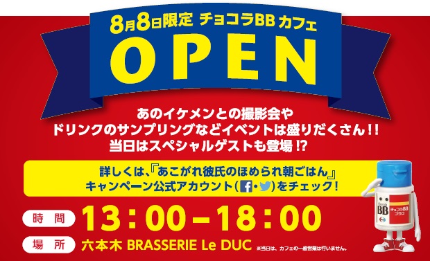 「チョコラBB」ブランドは誕生以来60年以上の間、キレイと元気を応援するブランドとして、ドリンクや錠剤をはじめとしたラインナップを展開してまいりました。日頃の感謝とともに、改めて生活者の皆様に大きな声でエールをお届けしたいという想いを込めて、「チョコラBB」の“B”の文字が並ぶブランド名にちなみ、8月8日を「チョコラBBの日」に制定いたしました。この記念企画として、「チョコラBBの日」である2015年8月8日(土)に、六本木ヒルズ BRASSERIE Le DUC(東京都 港区)において、1日限定イベント「チョコラBBカフェ」を13:00〜18:00(予定)の時間帯で開催いたします。