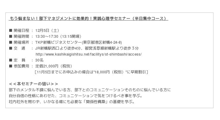 もう悩まない!部下マネジメントに効果的!実践心理学セミナー|12月5日(土)13:30〜|会場:TKP新橋ビジネスセンター