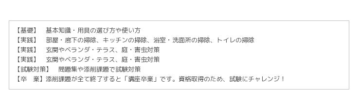 本講座ではハウスクリーニングの基本知識、掃除用具の選び方や使い方から、部屋や廊下、キッチン、浴室、洗面所、トイレ、玄関、ベランダ、テラスなど、様々な箇所の掃除方法、コツやノウハウ、適切な道具を使ったプロのテクニックを身につけます。