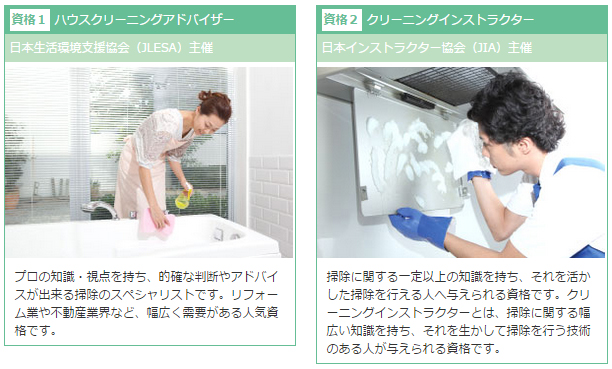 1.日本生活環境支援協会、日本インストラクター協会が主催する、「ハウスクリーニングアドバイザー」「クリーニングインストラクター」の資格をわずか2カ月で取得出来ます。