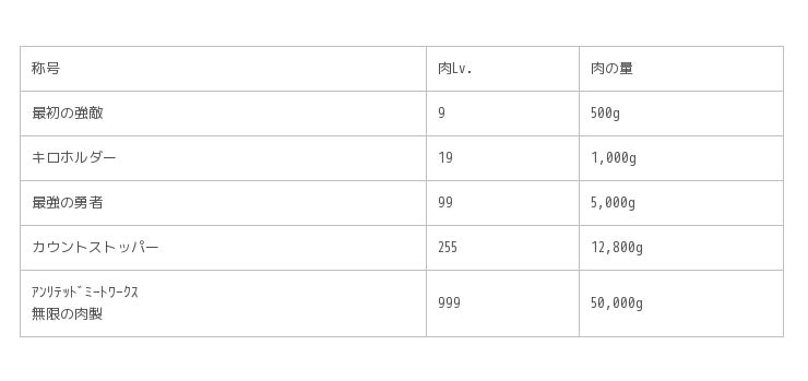 当店では、肉Lv.システム(ニクレベルシステム)を考案。肉Lv.1(通常サイズ:牛肉100g)から、Lv.を1つ上げていく毎に50gずつ、際限なく自分が食べたい分だけ増量することができます。(+300円/Lv。※通常Lv.10以上要予約)