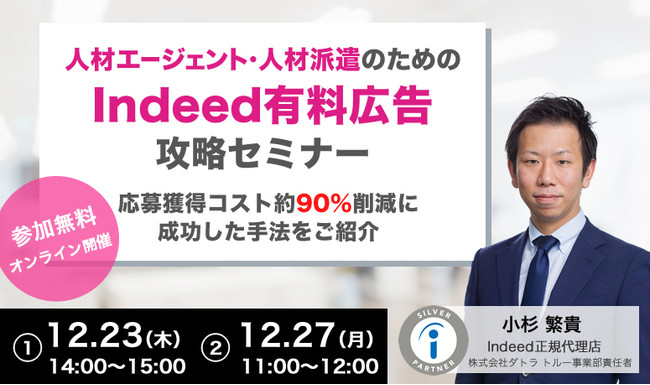 採用支援サービス「トルー」を運営する株式会社ダトラ(本社:大阪市中央区、代表取締役:草深悠介)は2021年12月23日(木)・12月27日(月)、『人材エージェント・人材派遣企業のためのIndeed有料広告攻略セミナー』を無料開催いたします。