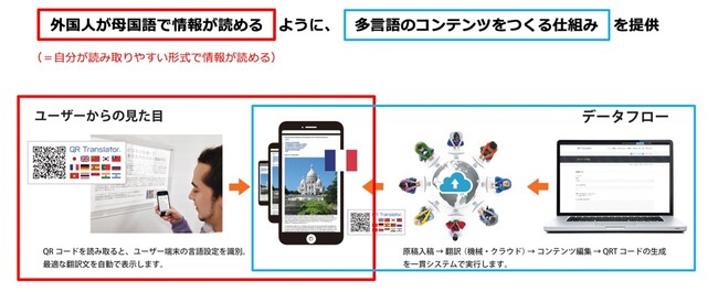 QR Translatorは株式会社PIJINが開発・提供しているQRコードを使った多言語表示サービスです。ユーザーがQRコードをスキャンするだけで、ユーザー端末の設定言語が認識され、自動的に翻訳文を表示します。