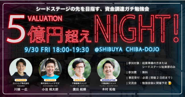千葉道場ファンドは新たに開設した渋谷コミュニティスペース」にて、起業家の皆様を対象にした参加無料の勉強会「時価総額5億円超えNight!!」を開催いたします。