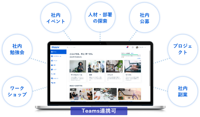 muuv(ムーブ)は社員個々人が持つスキル・経験を簡単に可視化・共有し、社内公募や社内イベント・勉強会等の社員と新たな知識・スキルを拡大できる成長機会をマッチングすることで、一人ひとりのキャリア自律と協働性の向上を支援する国内初のタレントマーケットプレイス※です。