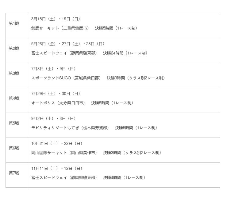 本年度のスーパー耐久シリーズである、ENEOS スーパー耐久シリーズ2023は、以下のスケジュールで開催されることが予定されています。
