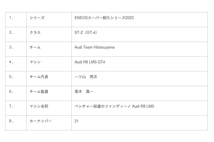 ENEOSスーパー耐久シリーズ2023のST-Z(GT-4)クラスに参戦するAudi Team Hitotsuyamaの概要は以下の通りです。