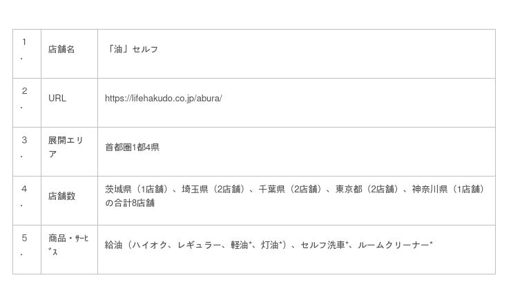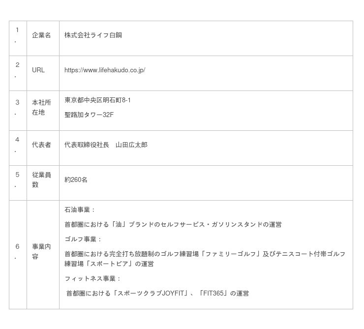 当社は、ガソリンスタンド、ゴルフ練習場、フィットネスジム等の小売サービス業(計15店舗)を首都圏にて展開する企業です。当社の概要は以下の通りです。