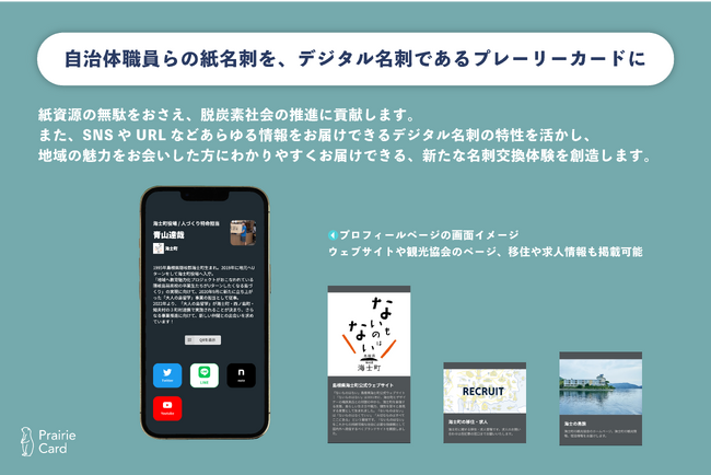 デジタル名刺「プレーリーカード」は人と人との自己紹介はもちろん、地域や自治体ごとのプロフィールページを作成することで、その土地、空間の魅力をわかりやすくお伝えする情報発信ツールとしてもご利用いただけます。コミュニケーション活性、魅力発信などの分野において地方創生の促進を可能にします。また、紙名刺の削減も促進できるため、脱炭素社会の推進にも貢献いたします。