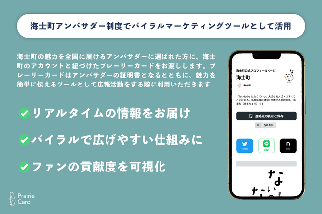 海士町アンバサダー制度を新たに創設。海士町の魅力を全国に届けるアンバサダーに選ばれた方に、海士町のアカウントと紐づけたプレーリーカードをお渡しします。お渡しされたプレーリーカードはアンバサダーの証明書となるとともに、飲み会などの場で海士町の魅力を簡単に伝えるツールとして広報活動をする際に利用いただきます。