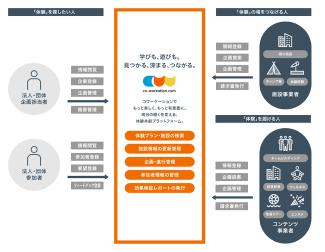 「コワーケーション.com」は、共に(CO)働く(WORK)仲間と、オフィスだけではない滞在体験(WORKATION)が見つかる、明日の働くを変える、体験共創プラットフォームです。