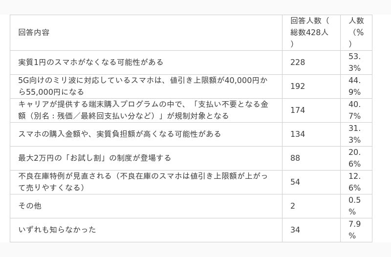 回答人数は総数428人で、最も多い回答は、53.3%(228人)の「実質1円のスマホがなくなる可能性がある」でした。