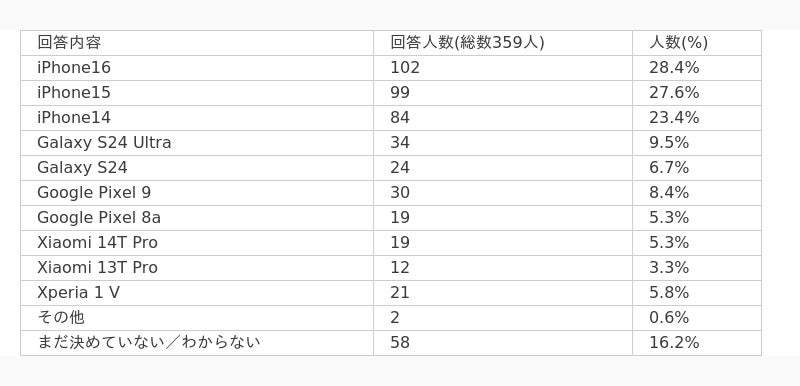 全回答359人のうち、iPhone16が最も多く28.4%を占め、次いでiPhone15が27.6%、iPhone14が23.4%となりました。