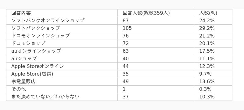 ソフトバンクショップが29.2%(105人)で最多となり、ソフトバンクオンラインショップ24.2%(87人)、ドコモオンラインショップ21.2%(76人)などが続きました。