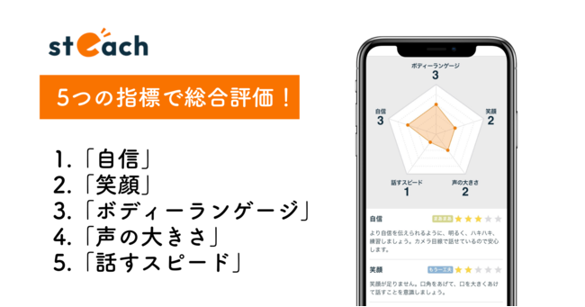 『steach』は、これまで3万6千名以上(*1)の就職支援を行ってきたジェイックの求職者からのニーズをもとに、「ひとりで気軽に面接練習ができて、客観的な評価がもらえる」環境を実現するためにスマホアプリを開発しました。ジェイックがこれまで培ってきた面接対策ノウハウを、AIを活用することでユーザーが回答した音声と動画を5つの指標で定量的に評価を行います。これまでも面接練習アプリは多数ありましたが、音声と動画を活用した総合的な評価をAIが行うiOS/Androidアプリは業界初です。(*2)