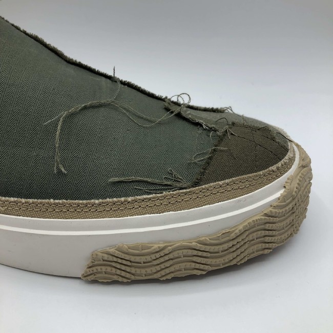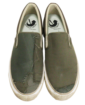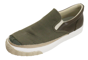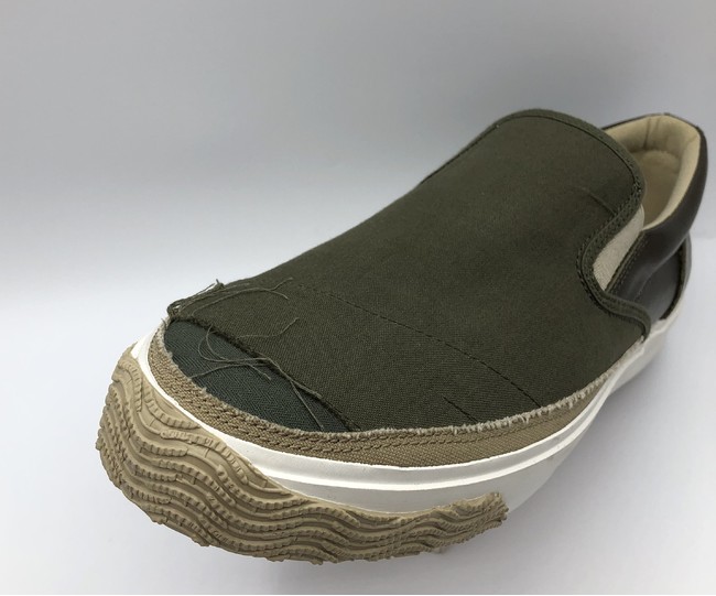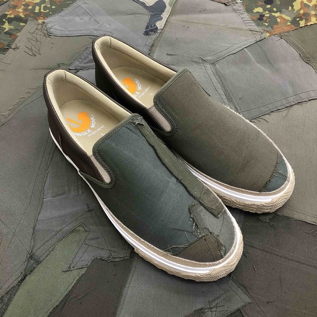 アッパーには主にフランス軍、ドイツ軍のデッドストックとユーズドのミリタリーパンツを解体し、ミックスしてパッチワークした再生生地を使用しています。このパッチワーク生地特有の雰囲気を活かすため、甲部面積の大きいスリッポンタイプを採用し、左右・商品ごとに外観が異なるオンリーワンのデザインになっています。