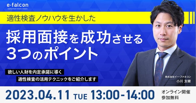 業界最多の測定項目でタレントマネジメントに活用できる適性検査『eF-1G(エフワンジー)』を提供する株式会社イー・ファルコン(本社:東京都中央区、代表取締役社長:田中伸明)は、欲しい人材を内定承諾に導く秘訣を伝授する『適性検査ノウハウを生かした、採用面接を成功させる3つのポイント』セミナーを2023年4月11日(火)にオンラインで開催します。