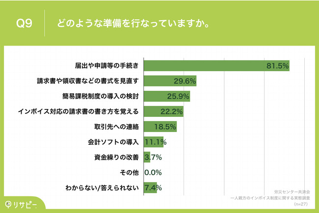 Q1で「できている」「ややできている」かつQ6で「課税事業者になる予定」と回答した方に、「Q9.どのような準備を行なっていますか。」(n=27)と質問したところ、「届出や申請等の手続き」が81.5%、「請求書や領収書などの書式を見直す」が29.6%、「簡易課税制度の導入の検討」が25.9%という回答となりました。