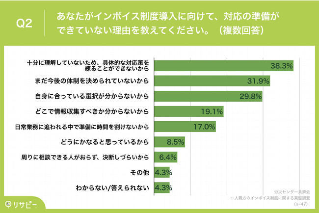 Q1で「あまりできていない」「全くできていない」と回答した方に、「Q2.あなたがインボイス制度導入に向けて、対応の準備ができていない理由を教えてください。(複数回答)」(n=47)と質問したところ、「十分に理解していないため、具体的な対応策を練ることができないから」が38.3%、「まだ今後の体制を決められていないから」が31.9%、「自身に合っている選択が分からないから」が29.8%という回答となりました。